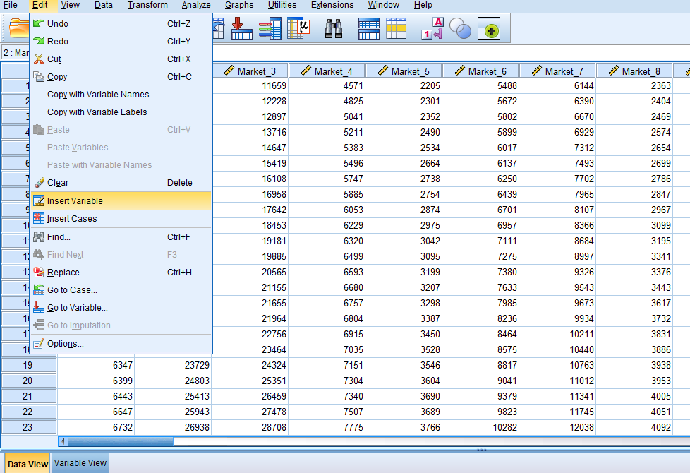 برای ویرایش کردن اطلاعات وارد شده در نرم افزار SPSS میتوان از پنجره Variable View یا Data View استفاده کرد؛ در پنجرهی Variable View میتوان مستقیما تمامی دادههای وارد شده مربوط به یک متغیر را با انتخاب هر کدام از آن ها تغییر داد در حالی که در پنجرهی Data View با مراجعه به قسمت Edit از نوار منو میتوانید تغییرات مورد نظر را اعم از Copy, Paste, Insert, Replace و موارد دیگر را انجام دهید.